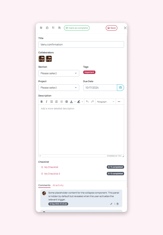 This section allows you to track all your tasks, due dates, descriptions, and checklists in one place. It helps you stay organised by showing tasks that are upcoming, overdue, or completed, ensuring you can manage your workload efficiently and stay on top of deadlines.