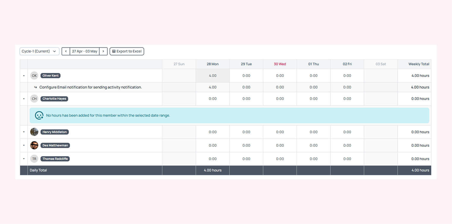 We provide you with an easy way to track your billable hours in a table, making it more convenient for you.